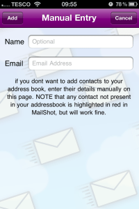 We had a few requests from people who wanted to manually add contacts to MailShot without going through the address book system (as they didn’t want these people among their regular contacts?). This allows them to do just that.