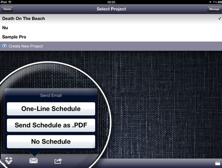 - Send Schedule as .PDF: a graphic page, similar to how the project appears in the app. (It can also be printed on receipt.)