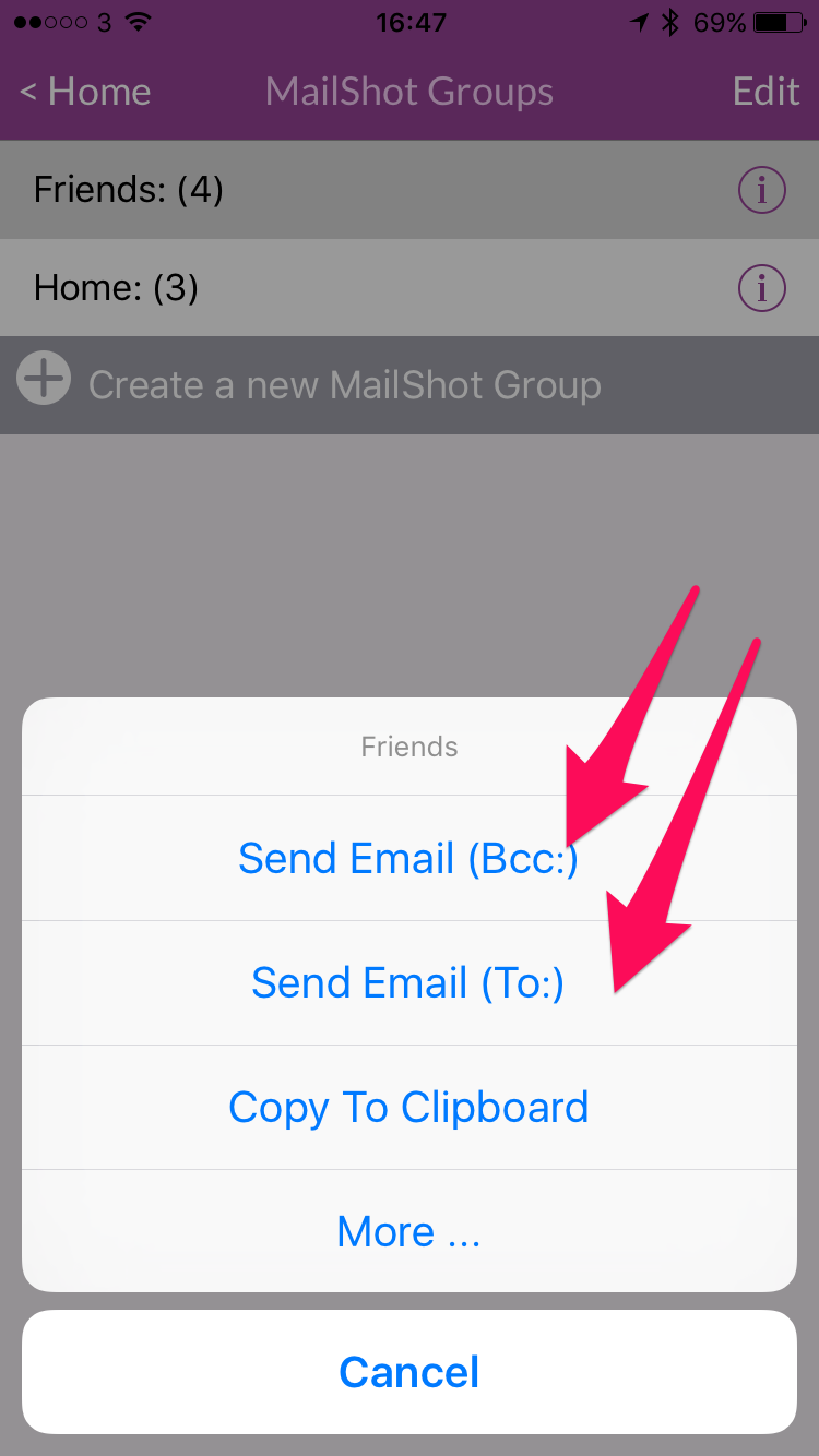 To create a new email, select a group in MailShot. Then tap “Send Email”