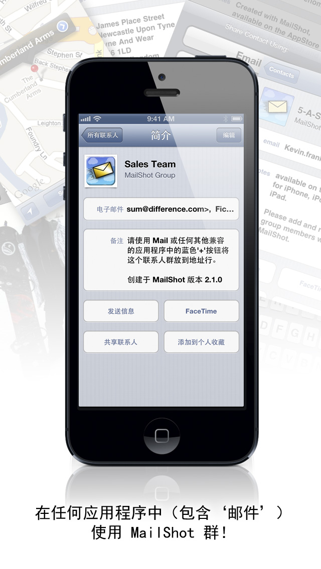 ★ 几乎可在任何应用程序中使用 MailShot 群联系人,就像普通联系人那样。
