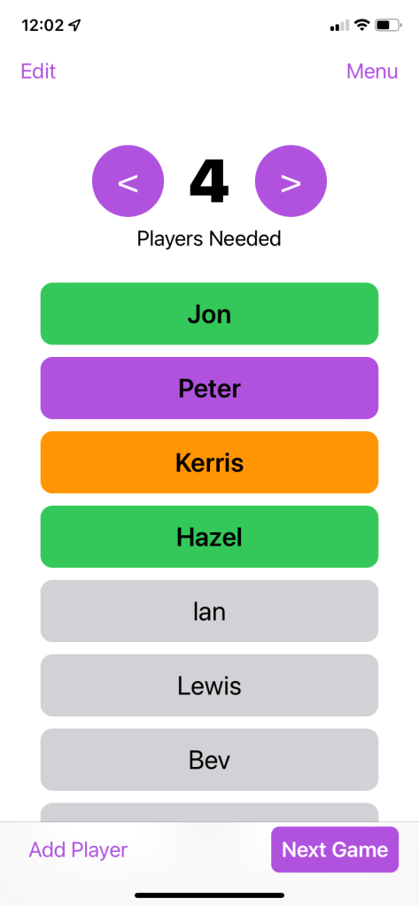 Choose how many players you need for the next game. The app will use the information it has to suggest the best combination to play next.