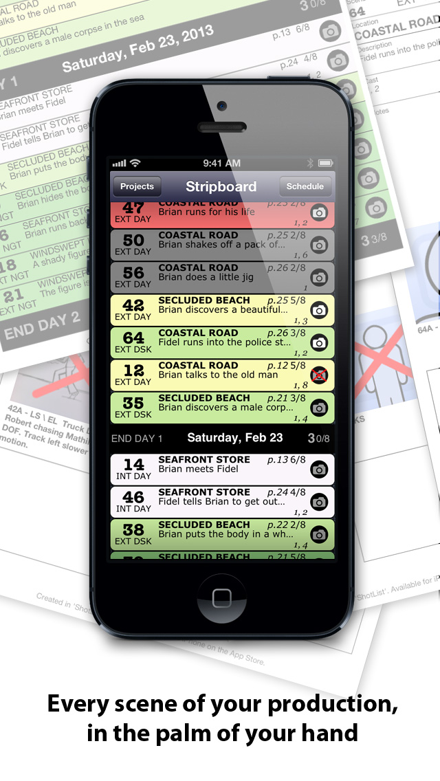 Production stripboard systems have been used for many years to plan professional movie shoots, and ShotList is the first app to bring a standalone Stripboard system to Apple’s App Store. Shotlist 4.0 can be used as a daily “To do” list on larger productions, keeping essential notes and storyboards in your pocket and tracking progress on the day of the shoot by checking off scenes and shots as they are completed.