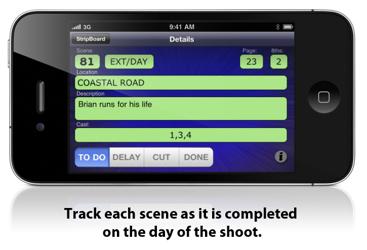 - Each scene can be clearly marked as “To Do”, “Delay”, “Cut” or “Done” as you shoot, ensuring a vital scene is not missed.